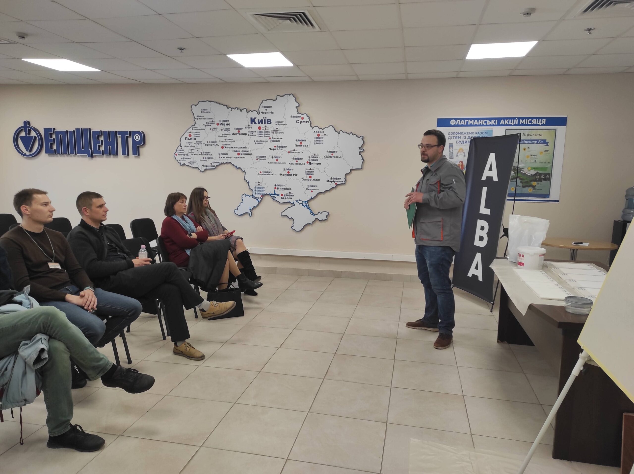 Презентацію відвідали продавці-консультанти мережі магазинів “Епіцентр”, промоутери, будівельники та майстри з ремонту. Технологи ТзОВ “Альба” детально розкрили присутнім усі технічні характеристики продукту, а ті, своєю чергою, власноруч спробували його в роботі.
